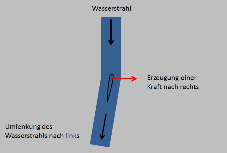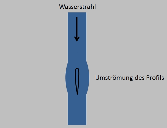 Dass Profil wird nun vom Wasserstrahl umströmt. Nun Schwenken wir das Profil etwas zu einer Seite. In Fliegersprache ausgedrückt: Wir geben dem Profil etwas Anstellung.